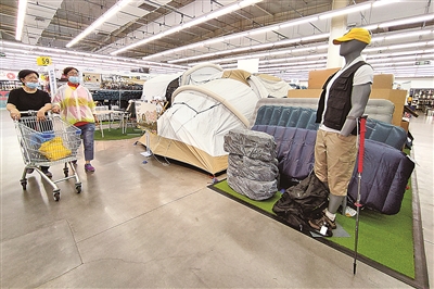在迪卡侬,各种露营商品摆放在显眼的位置。
