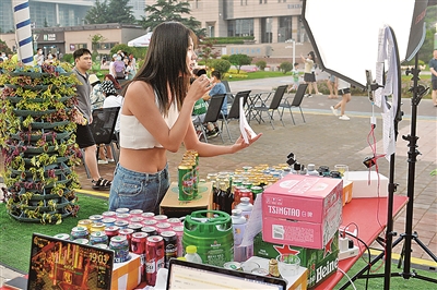 ■电商在崂山世纪广场直播带货青岛啤酒。 邢志峰 摄