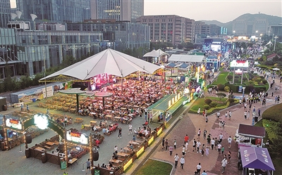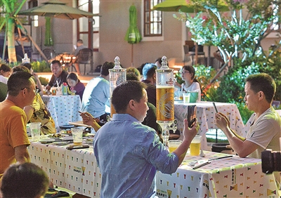 ■入夜后的崂山世纪广场啤酒花园内人声鼎沸。 邢志峰 摄