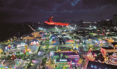 ■夜幕降临,凤凰飞行器翱翔于金沙滩啤酒城上空。 邢志峰 摄