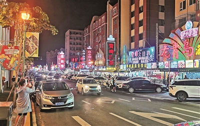 ■雨后的登州路青岛啤酒街灯火璀璨,游客云集。 邢志峰 摄