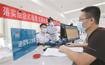 ■近年来,国家税务总局青岛市市北区税务局着力聚焦退役士兵重点群体,在各办税厅开辟退役军人办税“绿色通道”,针对不同创业就业群体精准提供政策指引、政策快享等服务,为退役士兵稳就业保就业贡献“税力量”。图为该局工作人员正在为退役军人办理相关涉税业务。