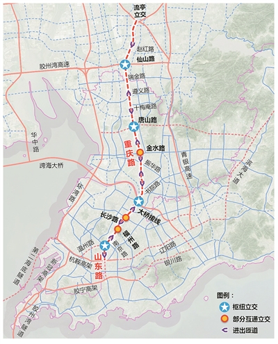 3.项目概况:根据青岛市城市总体及道路网规划,重庆路快速路南起山东路,北至流亭立交,全长约22公里(含跨海大桥高架路立交范围内已建成2公里),是贯穿东岸城区南北主要的交通走廊,也是东岸城区重要的对外联系通道。规划方案为高架主线双向6车道,地面辅路双向8车道。全线设置雁山立交、跨海大桥高架路立交(已建成)、唐山路立交、仙山路立交4座枢纽立交,及长沙路立交、福州路立交、金水路立交3座部分互通立交,同步设置上下桥匝道服务沿线到发交通。项目的建设可完善东岸城区快速路网,提高沿线区域出行效率,并有效缓解环湾路、黑龙江路、青银高速等南北通道的交通压力。