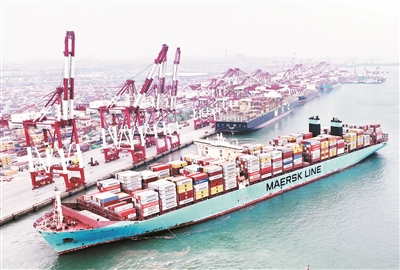 ■在山东港口青岛港前湾码头,欧洲贸易航线的“美途马士基”集装箱货轮解缆起航(2022年7月29日摄,无人机照片)。 新华社照片