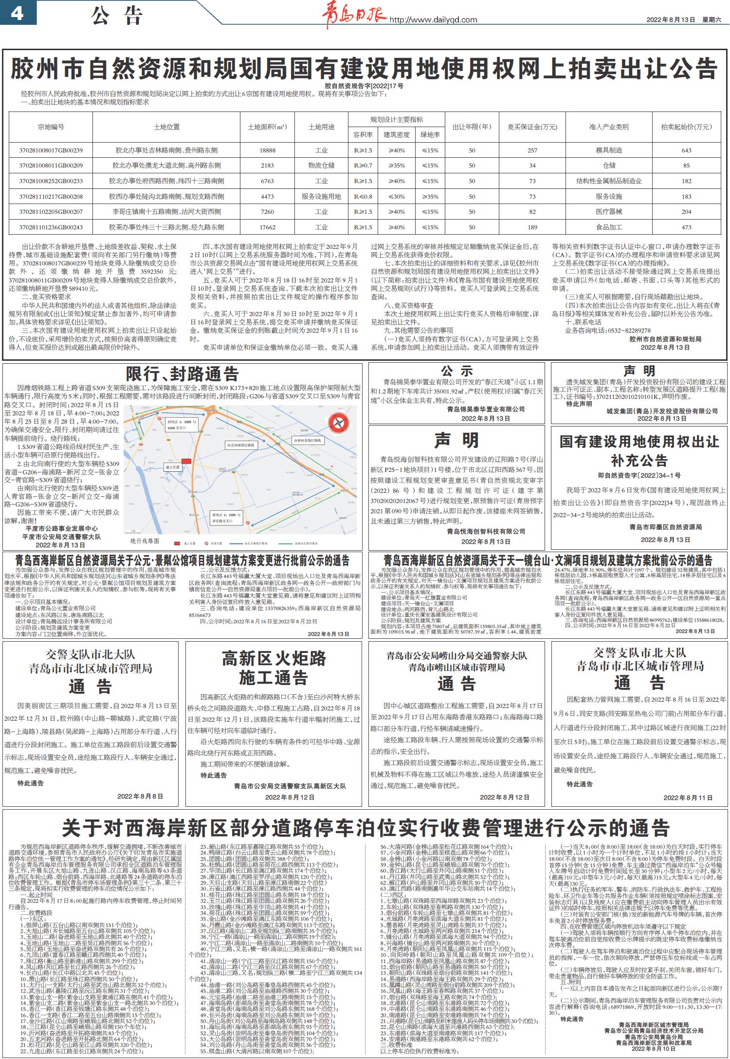 胶州市自然资源和规划局国有建设用地使用权网上拍卖出让公告