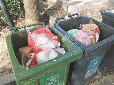 ■崂山区丽海馨苑小区内的厨余垃圾桶和可回收垃圾桶内混装了可回收垃圾。