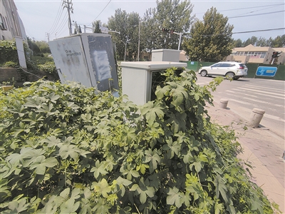 8月19日,记者在现场看到,两个损坏的电缆箱淹没在齐腰的杂草之中。较矮的电缆箱门不知去向,杂草长满了整个箱体,已辨别不出箱子的归属。高点的箱体已倾斜变形,导致前后两扇门无法闭合,密密麻麻的线缆从箱子内散落出来。其中一个箱体上印有“中国联通”字样,箱体四周还被喷绘了许多小广告。