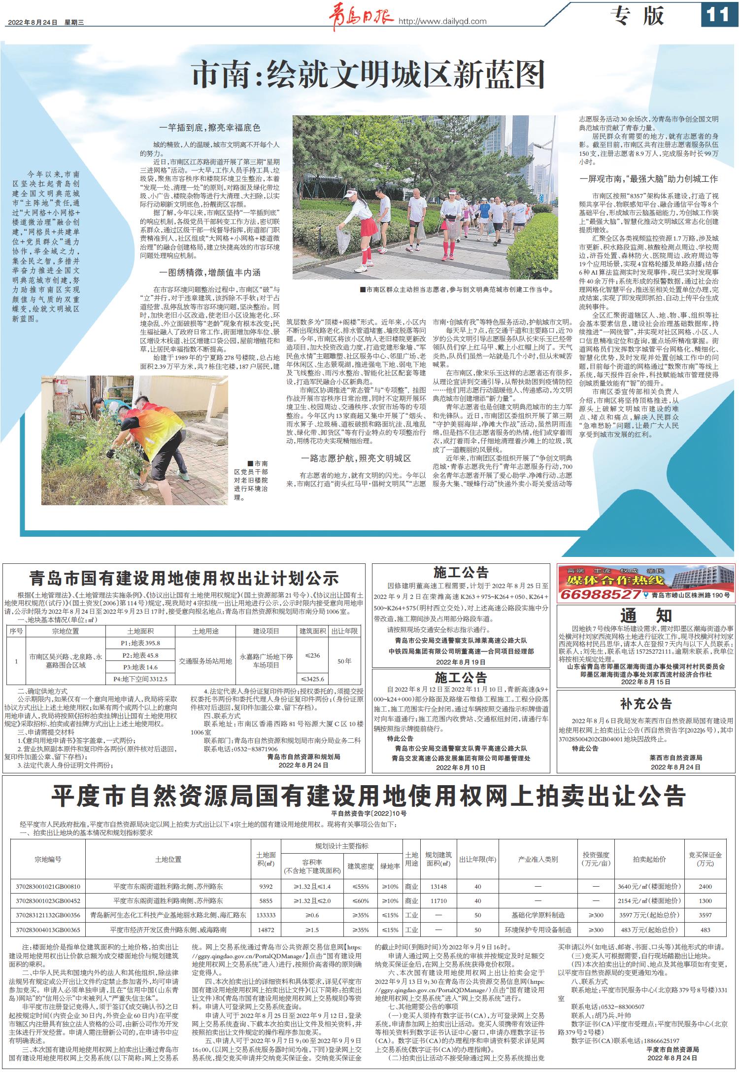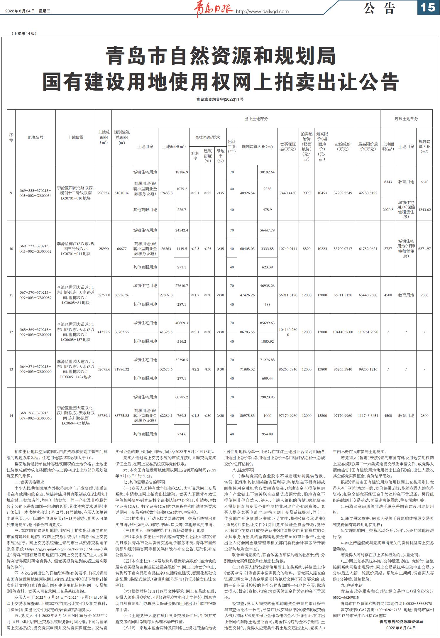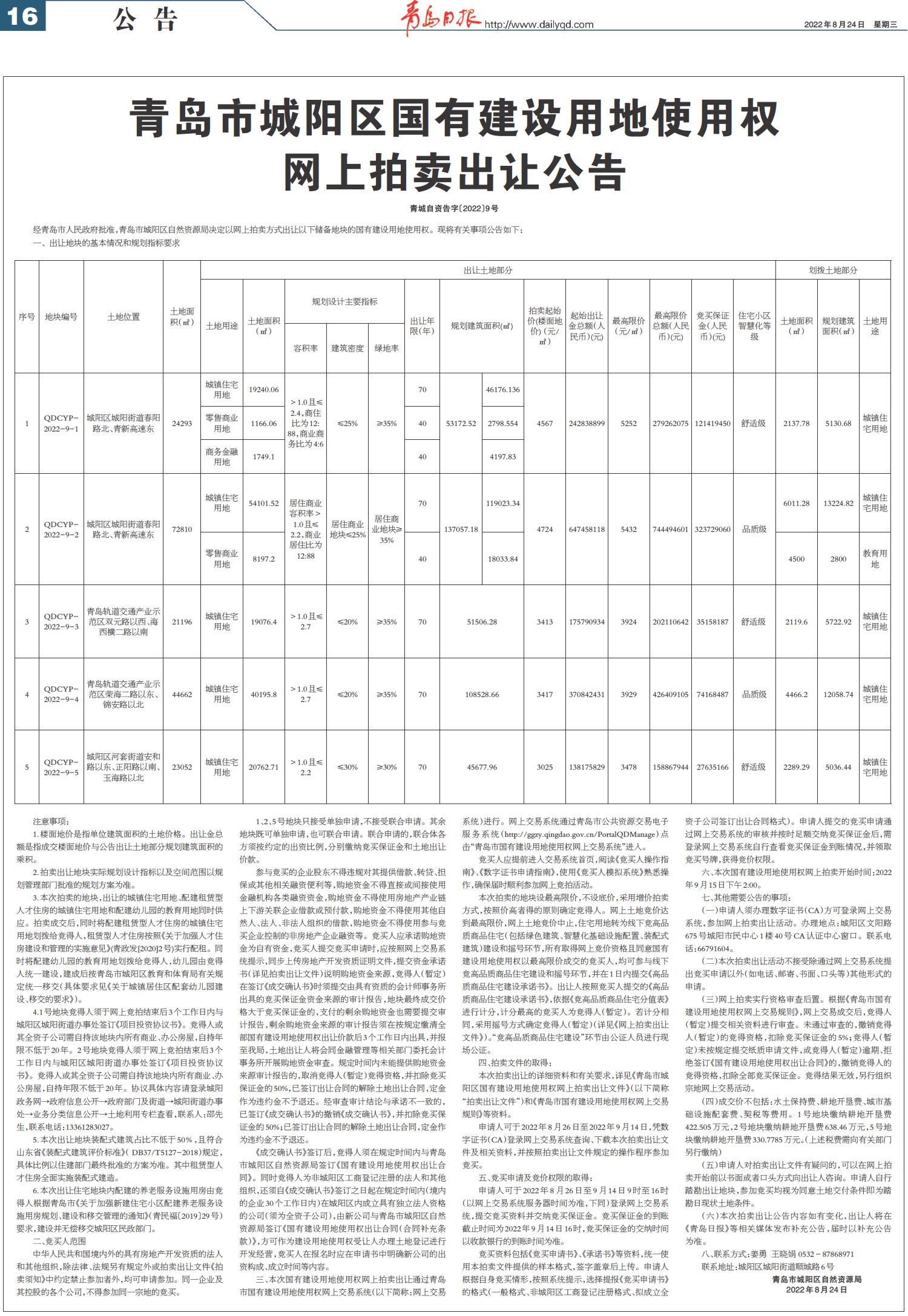 青岛市自然资源和规划局国有建设用地使用权网上拍卖出让公告