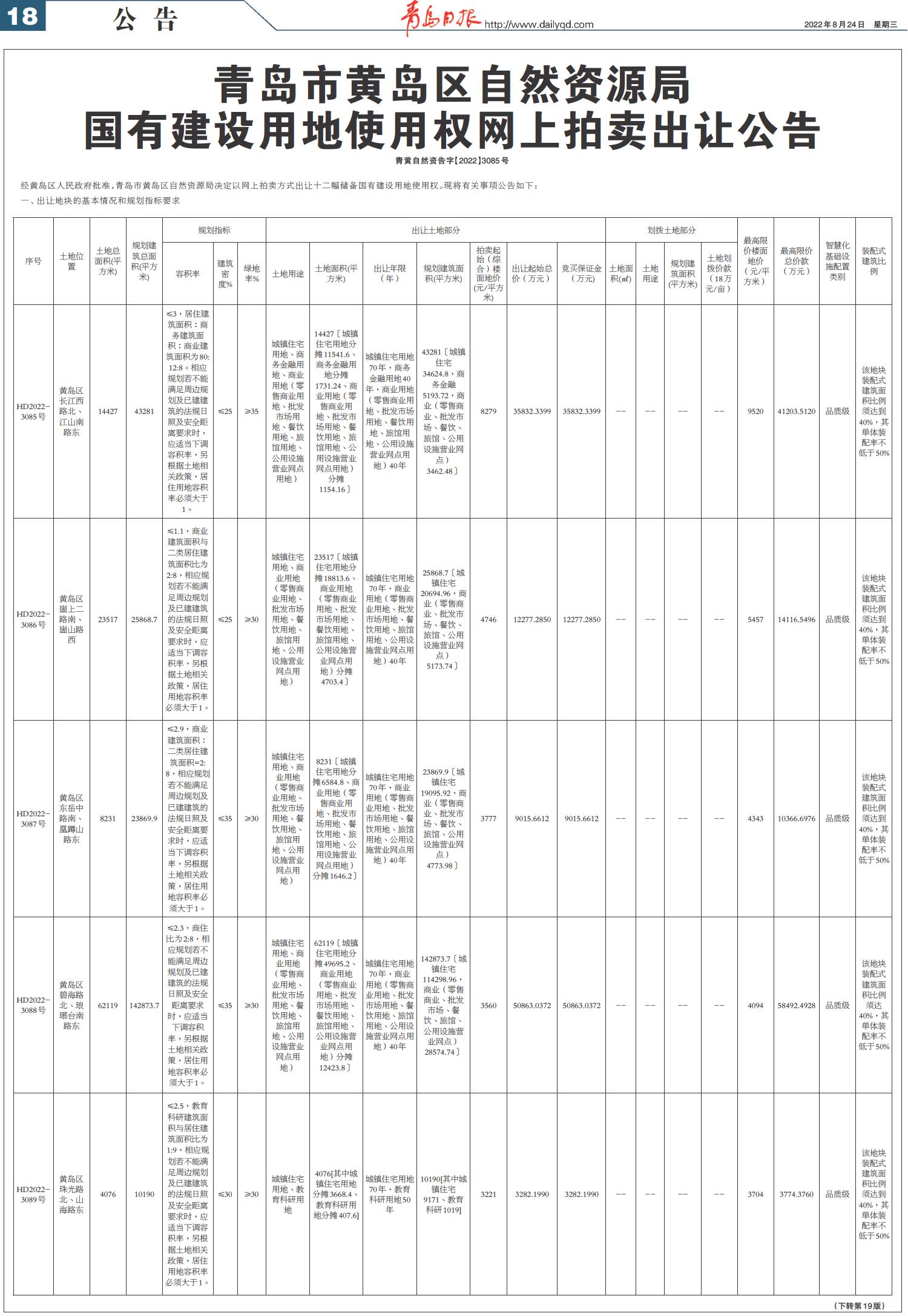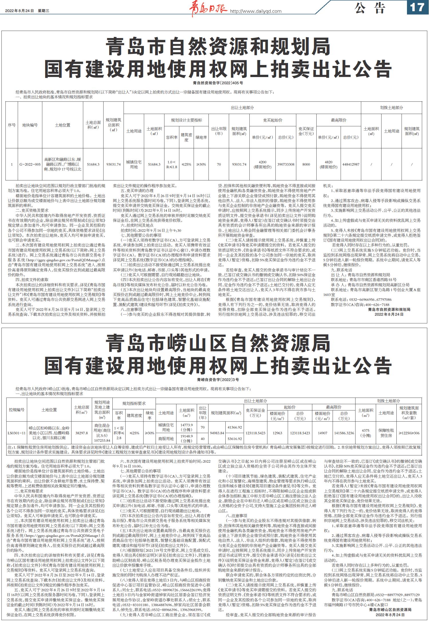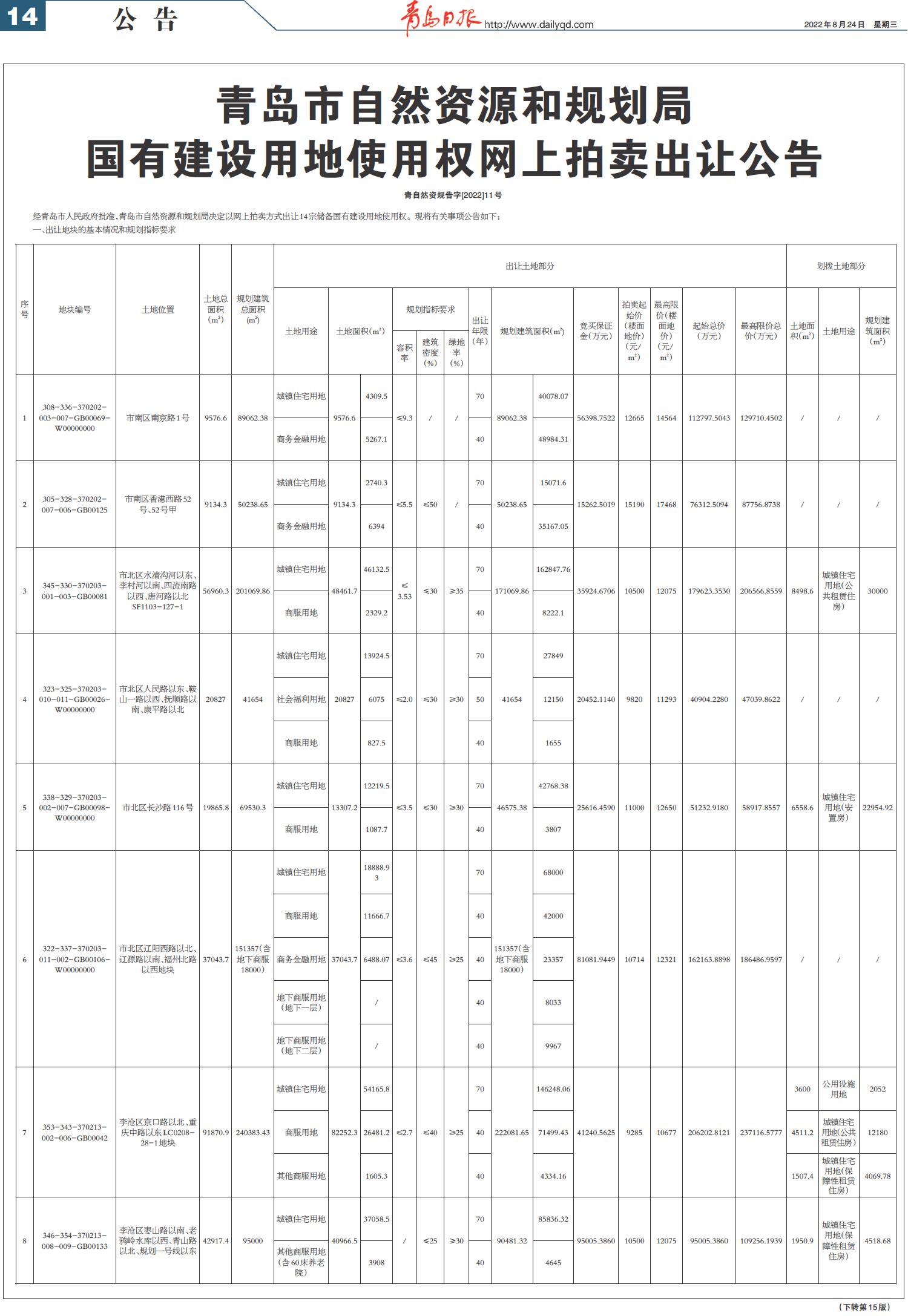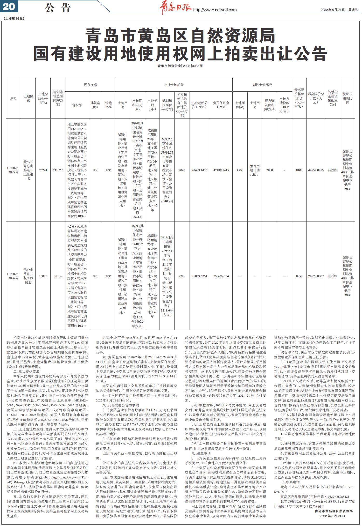 青岛市自然资源和规划局国有建设用地使用权网上拍卖出让公告