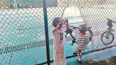 ■平度市围山河公园内的球场围网破了个大洞,两名儿童从中穿行。