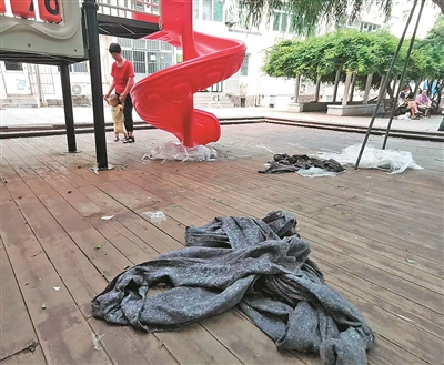 ■市南区江西路游园的儿童滑梯区散落着垃圾。