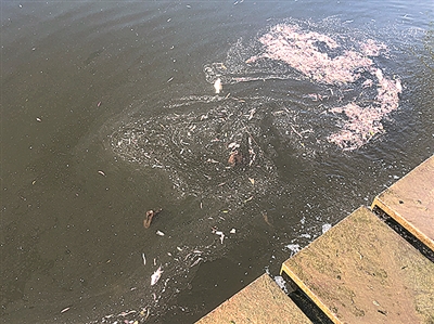 8月21日清晨,记者来到李沧区永清路实地探访。该公园内有一处狭长的景观湖,水域面积约1.9万平方米。记者绕着景观湖转了一圈发现,北岸附近的湖面上有一片十几米长的油污带,九条翻着白肚皮的小鱼漂在油污带内;湖水中心区域有大片泡沫,漂浮着七八条死鱼。记者又步入连接东西两岸的小桥,看到脚下的水面上有长约两米的垃圾带,里面的死鱼已经出现腐烂迹象。沿湖散步的李女士指着湖里的一条小船说:“大雨过后,水质变差,湖里死了很多鱼,但没有人及时清理。这条小船原本是用来打捞水面垃圾的,可船舷上已经长出了近一米高的杂草。”