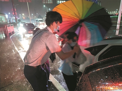 ■6月27日凌晨,青岛北站员工撑起“彩虹伞”帮助乘客转移。