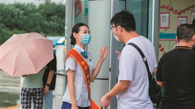 ■在井冈山路站,站务人员热情为乘客提供服务。