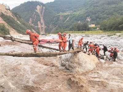 9月5日,武警四川总队机动第二支队官兵在甘孜州泸定县磨西镇磨子沟村搭建临时木桥转移被困群众。 新华社照片