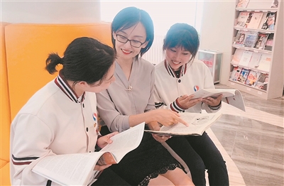 ■青岛外事学校国际贸易专业教师孟静(中)课间与学生交流。