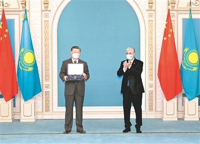 托卡耶夫致授勋辞。托卡耶夫表示,今天,伟大的中国国家主席习近平访问哈萨克斯坦,是哈方的莫大荣幸。习近平主席是一位真正的伟大领袖,得到中国人民的衷心拥护。在习近平主席卓越领导下,中国取得伟大发展成就,消除了绝对贫困,全面建成了小康社会,中华民族伟大复兴进入新征程。相信在习近平主席英明领导下,中国必将如期实现全面建设社会主义现代化国家的宏伟目标。习近平主席提出共建“一带一路”和构建人类命运共同体的伟大倡议,为推动建设新型国际关系作出杰出贡献。习近平主席提出的全球发展倡议和全球安全倡议,对于解决当今世界面临的风险挑战具有重要战略意义。