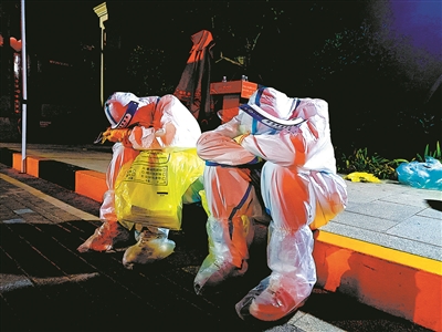 ▲一线抗疫人员累了就坐在地上休息一会儿。