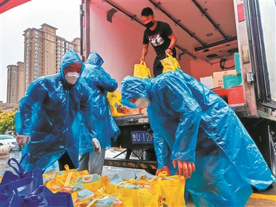 ■党员群众冒雨保市民生活物资供应。