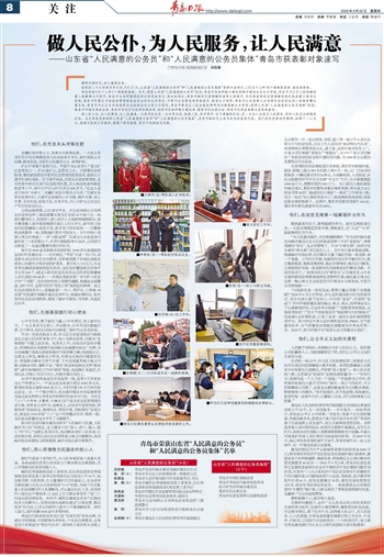 做人民公仆,为人民服务,让人民满意。公务员队伍是一支对党忠诚、热爱人民、恪尽职守、甘于奉献的队伍,是一支全心全意为人民服务、党和人民充分信赖的队伍。这次青岛受表彰的山东省“人民满意的公务员”和“人民满意的公务员集体”,是我市新时代公务员队伍的优秀代表。他们的先进事迹和精神,诠释了一心为公、造福于民的公仆情怀,展现了踔厉奋发、笃行不怠的时代风貌。