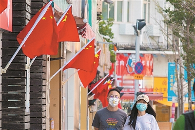 图⑧:市民从文登路的国旗下走过。 于 滈 摄