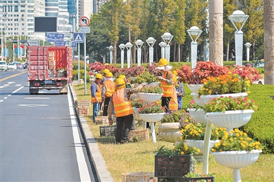 图④:东海西路上,施工人员正在修整路边花坛。 于滈 摄