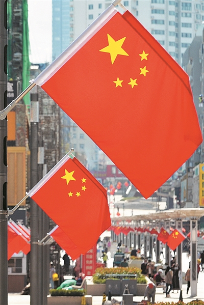 图②:台东三路步行街,一面面五星红旗迎风招展。 邢志峰 摄