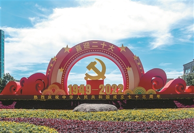 在五四广场,新落成的“喜迎二十大 奋进新征程”庆祝新中国成立七十三周年大型景观吸引了众多市民前来拍照留念。在香港中路、福州南路、台东三路等多条道路上,五星红旗、红灯笼、主题景观等“中国红”元素扮靓城市街头;东海西路等主干道上还更换了国庆菊、万寿菊、长春花、千日红等各类时令花卉,营造出喜迎国庆、喜迎二十大的浓厚氛围。