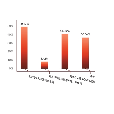 对于网点的适老化基础设施满意度方面,近99%的老年人选择满意、基本满意。结果表明,目前银行网点的适老化基础设施已得到了老年客户的广泛认可。但在进一步的调查采访中,部分老年人认为,服务网点还有多项服务存在改进空间。如,未对老年人设置绿色通道(49.47%),网点环境或设施不友好、不便利(8.42%),对老年人服务公示不明显等(41.05%)。调查结果反映出,当前,金融机构仍需进一步完善网点基础设施,让更多的老年人感受到服务网点的暖心服务。