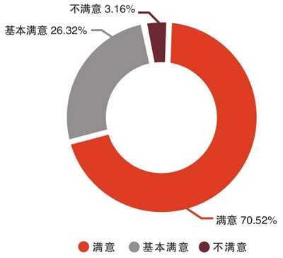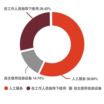 在业务办理方面,问卷调查了老年客户使用自助设备办理业务的满意程度以及使用情况。调查结果显示,70.52%的老年人对于使用自助设备办理业务表示满意。该数据表明,老年客户已接受智能化的业务办理方式,并对该方式表示满意。后续的调查中,有14.74%的老年人表示能够自主使用自助设备办理业务,28.42%的老年人能够在工作人员的帮助下使用自助设备办理业务。但仍有超过半数的老年人仍更加倾向于在柜台人工服务办理业务。