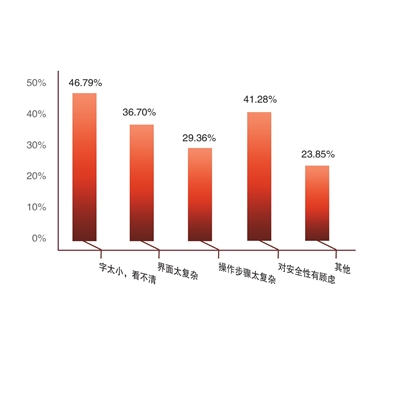 时代在更迭中总是与用户需求不断擦出火花,金融行业在不断改进和升级服务中,也将更加包容、多元的色彩奉献于不同层级的金融消费者面前。在此次的调研中,面对“您认为网上银行或手机银行服务还需改进的方面”这项问题,46.79%的老年人选择“字太小看不清”,36.70%的老年人选择“界面太复杂,找不到想要的功能”,还有29.36%的老年人认为“操作步骤太复杂,不会打字或不会使用”。似乎网上银行、手机银行等数字化金融服务给年轻一代带来生活便利时,消除横亘于老年人面前的 “数字鸿沟”仍需各方共同努力。