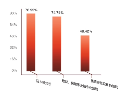 在被问到更希望了解哪些金融知识时,78.95%的老年人希望更多的学习到防诈骗知识,74.74%的老年人希望学习理财、保险等金融专业知识,48.42%的老年人希望学习使用智能设备的知识。调查结果显示,除了守好自己的“钱袋子”外,老年群体也表达出对于接收“金融知识”的热切期盼。在面对“数字鸿沟”的当下,老年人对于金融知识也表达出自己的“求知欲”,这也为下一步银行保险机构金融知识宣传普及的侧重点指出了方向。