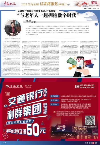 随着人口老龄化趋势加剧,推进适老化服务升级迫在眉睫。以银行业为代表的金融行业,面对日益增长的老年群体客户资源,积极开展金融服务适老化改革,不断提高金融服务的广度和深度。9月,青岛银保监局联合青岛日报报业集团开展“金融有温度 敬老我先行 2022青岛金融适老化服务体验月”活动,带领“银发金融体验官”们走进银行、保险机构体验适老化服务。同时,青岛日报记者与行长面对面,倾听“行长说适老”。近日,交通银行青岛分行党委书记、行长董莹,向记者分享了该行的适老化金融服务经验和成果。
