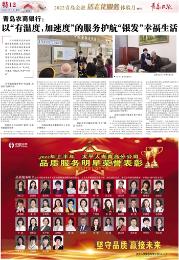 尊老、敬老、爱老、助老是中华民族的传统美德,秉承“老有所学、老有所养、老有所依”的核心宗旨,青岛农商银行深入践行普惠金融理念,推出通过构建“尊享+特色渠道”“尊享+特色服务”“尊享+特色产品”“尊享+特色支付”“尊享+特色宣传”五大老年客户金融服务板块,打造“尊享+”老年客户金融服务品牌。通过制定场景化适老服务方案、细致产品改进和流程改造,优化老年客户交互体验,全面提升养老领域多元化、全流程综合服务效能。连续两年入围国家金融标准委员会银行营业网点服务企业标准“领跑者”榜单,获评中国人民银行青岛市中心支行2021年度金融消费者权益保护工作A+级行,成功塑造集厅堂服务、智能创新、业务发展、教育宣传、社会责任于一体的“有温度,加速度”服务体系。