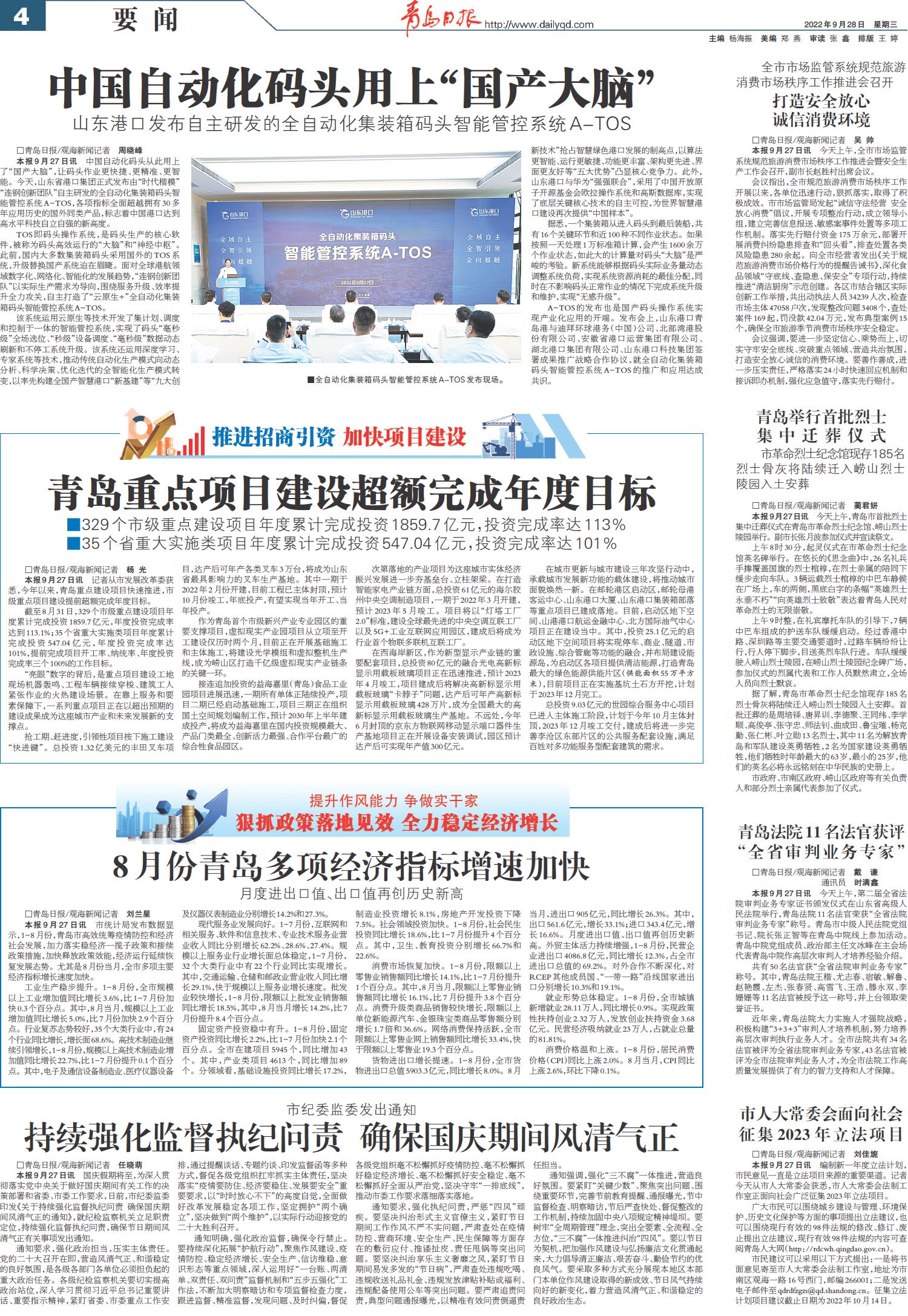 青岛重点项目建设超额完成年度目标