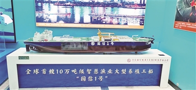 就在山东港口青岛港全自动化码头模型旁边,展出的是全球第一艘10万吨级渔业大型游弋养殖工船——“国信1号”模型。瞄准打造智慧化的海上“蓝色粮仓”,“国信1号”展现了青岛践行海洋强国战略的决心和向海图强的信心。“国信1号”由青岛国信集团投资设计建造,是全球首艘10万吨级智慧渔业养殖工船,在世界上首创了深远海“游弋式船载舱养模式”。