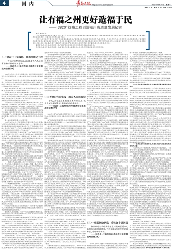 从福州20年战略设想到国家“十四五”规划和2035年远景目标,从闽江口金三角经济圈到粤港澳大湾区,从“海上福州”到“海洋强国”……站在新的历史起点回望,“3820”战略工程不仅是指引福州跨世纪发展的科学部署,也是中国共产党用中长期规划指导经济社会发展的生动实践,更是中国特色社会主义与时俱进的重大探索。