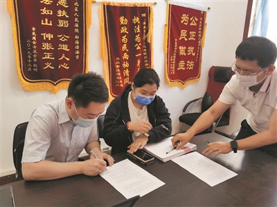 ▲经市北区法院调解,一起行政案件双方当事人签署调解协议。