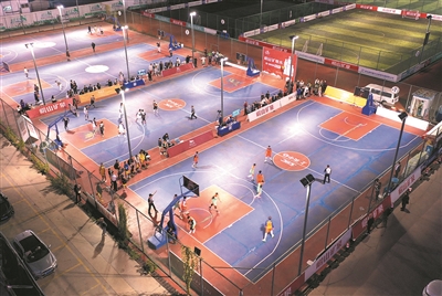 ■华灯初上,市民在海尔路东侧一处夜间篮球场打球健身。赵健鹏 摄