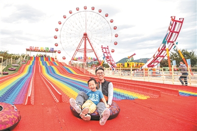 ■国庆假期,世博园内彩虹大滑道吸引了不少市民前来游玩,体验滑行带来的速度与激情。 杨志文 摄
