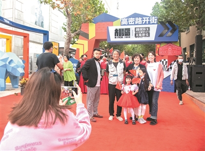 ■10月1日,青岛历史城区的高密路开街,市民在此感受老街新景。 刘 栋 摄