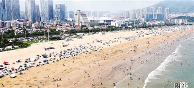 图①:青岛石老人海水浴场游人如潮。 王 雷 摄
