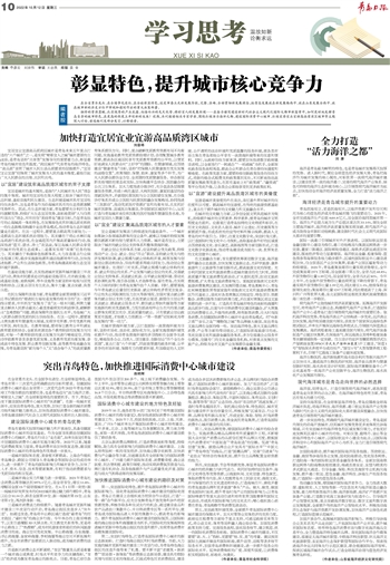 独特的资源禀赋、扎实深厚的产业底蕴、向海而兴的先天优势、精彩宜人的发展环境……在奋力谱写建设新时代社会主义现代化国际大都市新篇章中,如何更好地发挥青岛自身的城市特色,在更高的维度上开创新的未来?近期,本刊邀请相关专家学者,围绕打造活力海洋之都、建设国际消费中心城市、打造宜居宜业宜游高品质湾区城市等主题深入讨论,兹选编刊发部分发言,以飨读者。