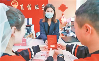 ■李沧区民政局婚姻登记处工作人员颁证后向新人赠送“百年好合”纪念章。