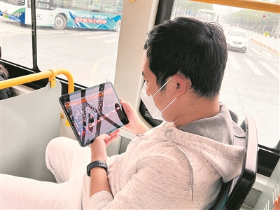 ■乘客在温馨巴士223路公交车上收看党的二十大开幕会盛况。 刘 栋 摄
