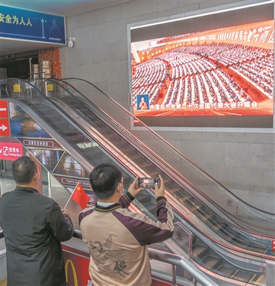 ■旅客在青岛长途汽车站通过大屏幕收看党的二十大开幕会盛况。 刘 栋 摄