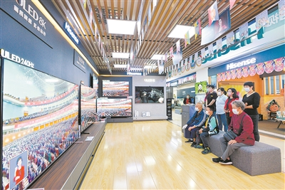 ■在利群商厦家电销售区,顾客和销售人员一起收看党的二十大开幕会直播。 于 滈 摄