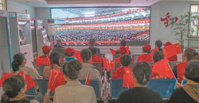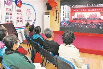 ■市南区中山路街道中山路社区居民一起收看党的二十大开幕会直播。 邢志峰 摄