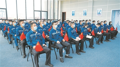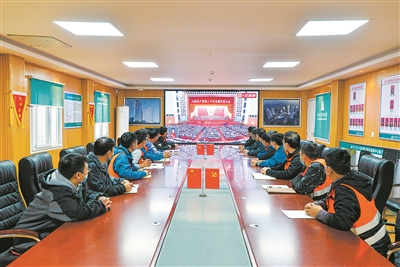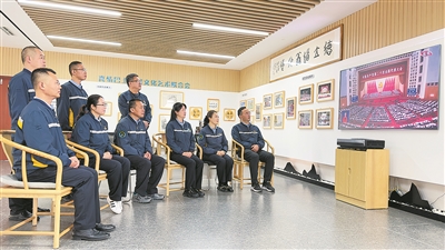 ■在山东港口青岛港全自动化码头交流中心,连钢创新团队成员和职工代表收看党的二十大开幕会盛况。