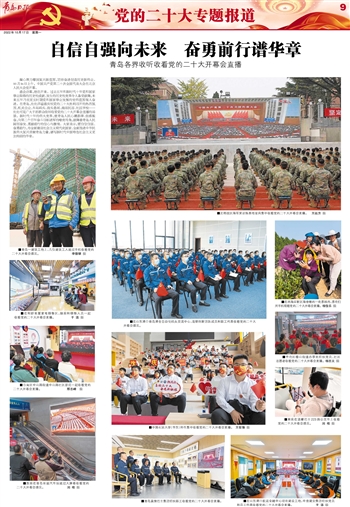 盛会启幕,继往开来。过去五年和新时代十年党和国家事业取得的历史性成就、发生的历史性变革令人备受鼓舞,未来五年乃至更长时期党和国家事业发展的宏伟蓝图催人奋进。在青岛,处处洋溢着庆祝党的二十大胜利召开的热烈氛围,机关企业、车站码头、街头巷尾、商场民居、社区学校……处处可见广大干部群众收听收看党的二十大开幕会直播的场景。新时代十年的伟大变革,使青岛人民心潮澎湃、倍感振奋,向第二个百年奋斗目标进军的嘹亮号角,鼓舞着青岛人民踔厉奋发、勇毅前行的信心与激情。大家表示,要自信自强、奋勇前行,为全面建设社会主义现代化国家、全面推进中华民族伟大复兴贡献青岛力量,谱写新时代中国特色社会主义更加绚丽的华章。
